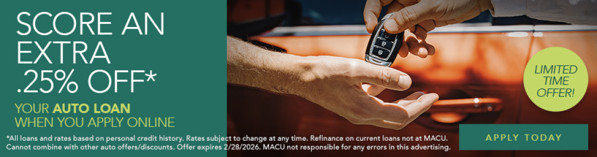 *All loans and rates based on personal credit history. Rates subject to change at any time. Refinance on current loans not at MACU. annot combine with other auto offers/discounts. Offer expires 2/28/2026. MACU not responsible for any errors in this advertising.