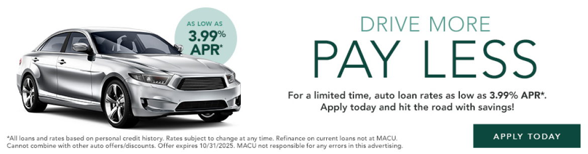 *All loans and rates based on personal credit history. Rates subject to change at any time. Refinance on current loans not at MACU. Cannot combine with other auto offers/discounts. Offer runs 10/1/2025 - 10/31/2025. MACU is not responsible for any errors in this advertising.